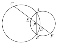 示例: 如图 18 所示,\(P\) 为两圆公共弦上一点,过 \(P\) 的直线交两圆于 \(C,D,E,F\) 如图所示。