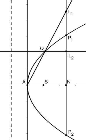 示例: 设 \(P_1P_2\) 是抛物线的双纵标线,\(P_1P_2\) 与轴交于点 \(N\) 。又设 \(Q\) 为抛物线上另一点,过 \(Q\) 作两条直线,一条通过顶点,另一条平行于轴,分别交 \(P_1P_2\) 于 \(L_1,L_2\)。 求证:\(NL_1\cdot NL_2=PN^2\) 。