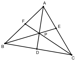 则直线\(AD\)、\(BE\)、\(CF\)共点或彼此平行(于无限远处共点)。当\(AD\)、\(BE\)、\(CF\)中的任意两直线交于一点时,则三直线共点;当\(AD\)、\(BE\)、\(CF\)中的任意两直线平行时,则三直线平行。