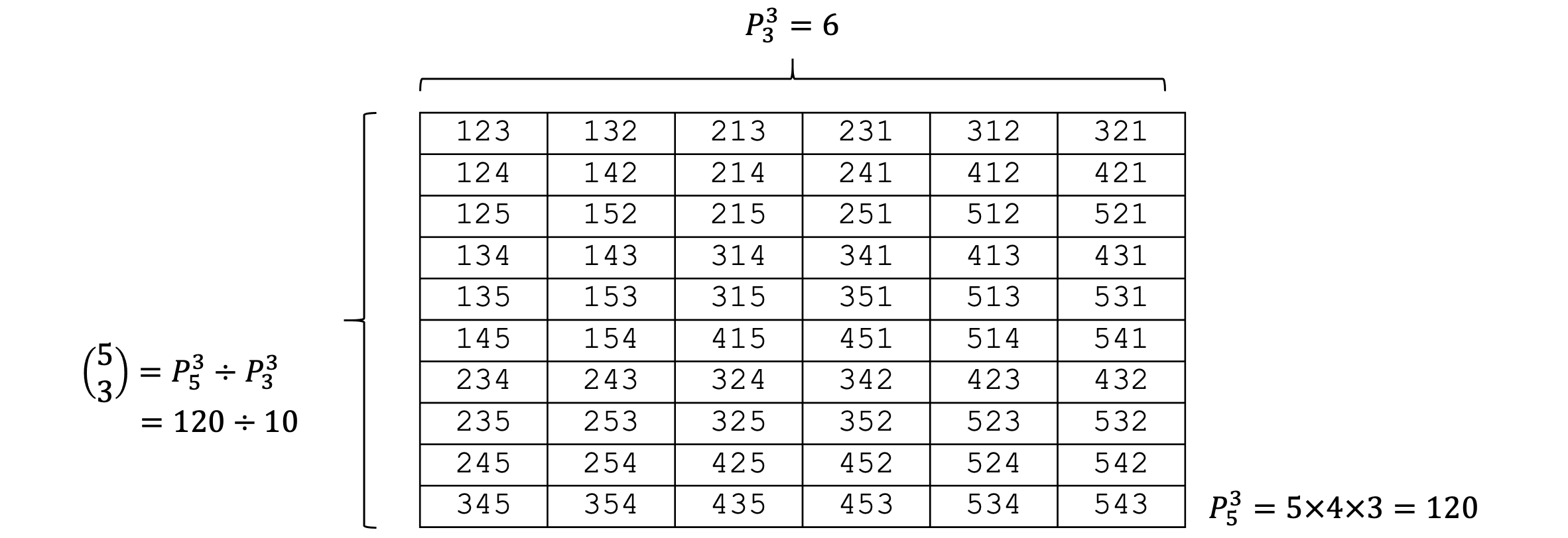 示例: 从 \(1\) \(2\) \(3\) \(4\) \(5\) 这 \(5\) 个数字中挑出 \(3\) 个数字,有多少种挑选方法?(次序不同算同一种方法,例如 \(1\) \(2\) \(3\) 和 \(1\) \(3\) \(2\) 是不区分的。)