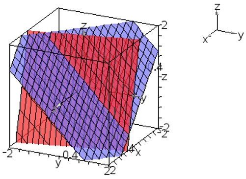 两个连立的三元一次线性方程组对应着两个平面。解有三种情况:(一)两个方程代表同一个平面,这意味着一个方程可以通过变换为另一个方程。这时方程组的解就是平面上的点的三维坐标;(二)两个方程代表的平面互相平行。这意味着两个方程可以变换为系数相同但常数项不同的方程。这时方程组没有解。(三)两个方程代表的平面不平行,这是最一般的情况,这是方程组的解就是两个平面的相交直线上点的三维坐标。
