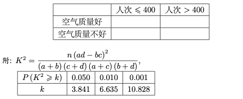 \(\quad\)(3) 若某天的空气质量等级为 \(1\) 或 \(2\) ,则称这天“空气质量好”;若某天的空气质量等级为 \(3\) 或 \(4\) ,则称这天“空气质量不好”。根据所给数据,完成下面 的 \(2 × 2\) 列联表,并根据列联表,判断是否有 \(95\%\) 的把握认为一天中到该公园锻炼的人次与该市当天的空气质量有关?