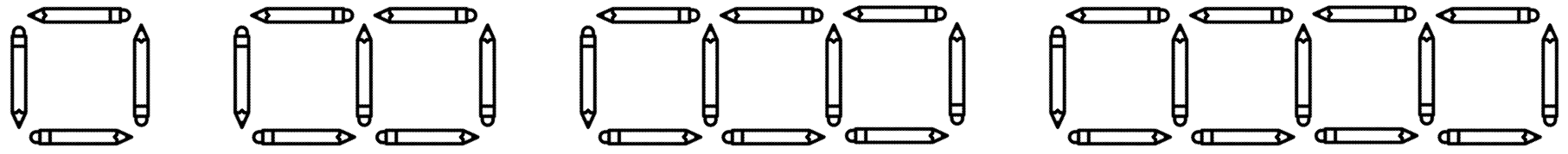 练习:16 Sophie 用火柴棍摆了十个房子,图 25 画出了这一排房子的前四个。请问 Sophie 摆这十个房子总共用了多少根火柴?